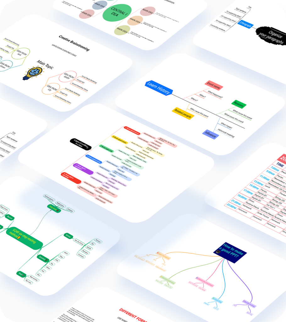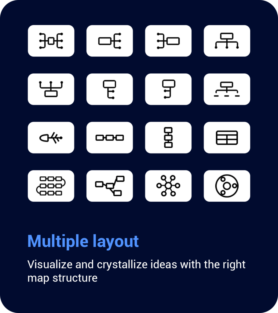 Two-sided maps, Treemaps, Organizational charts, Fishbone diagram, Timeline, Bubble diagram, Circle diagram, Free layout…