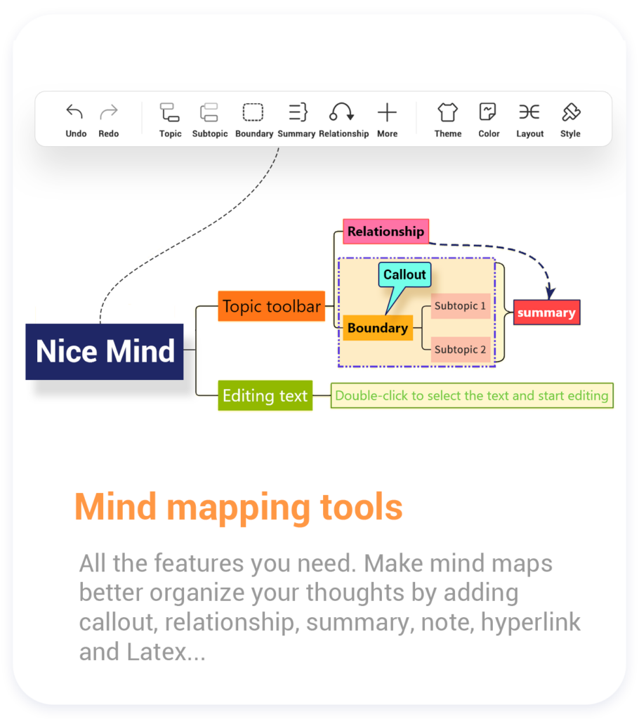 Make mind maps better organize your thoughts by adding callout, relationship, summary, note, hyperlink and Latex…